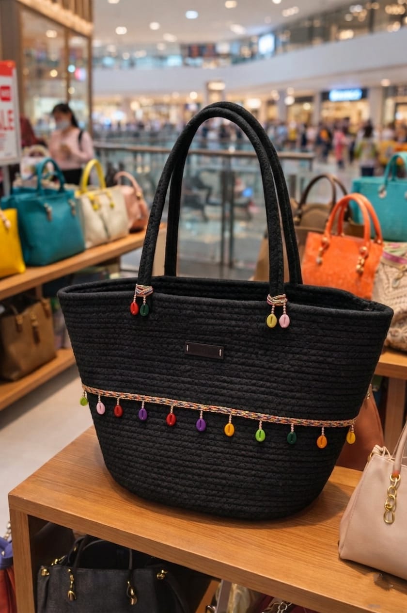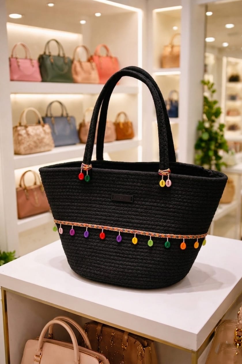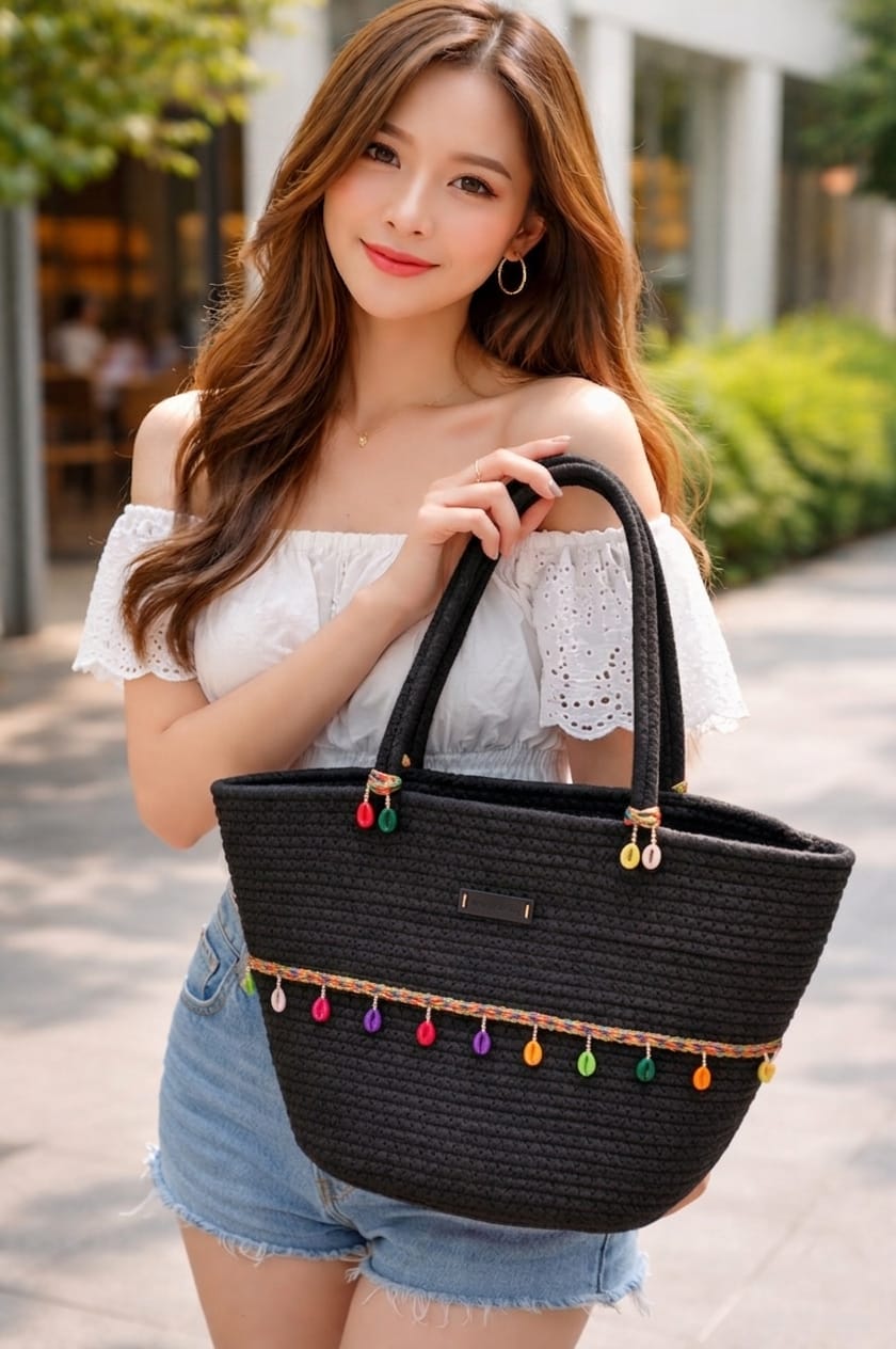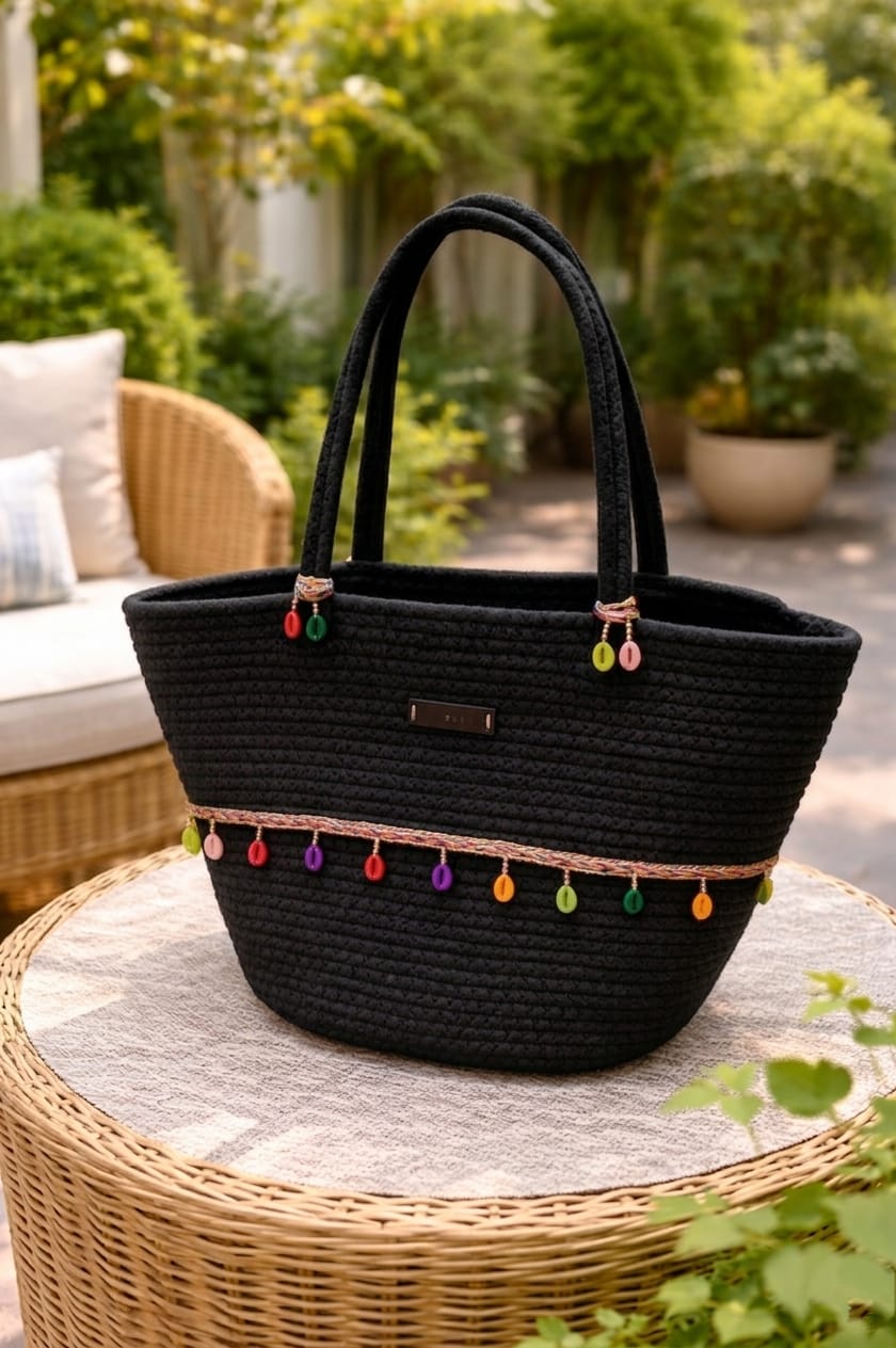 Cotton Rope Handmade Cotton rope bag Rope Crossbody – Bho Summer Pures Handmade Claret Woven Straw Bag: Boho Wooden Handle Pures COLER BLACK
