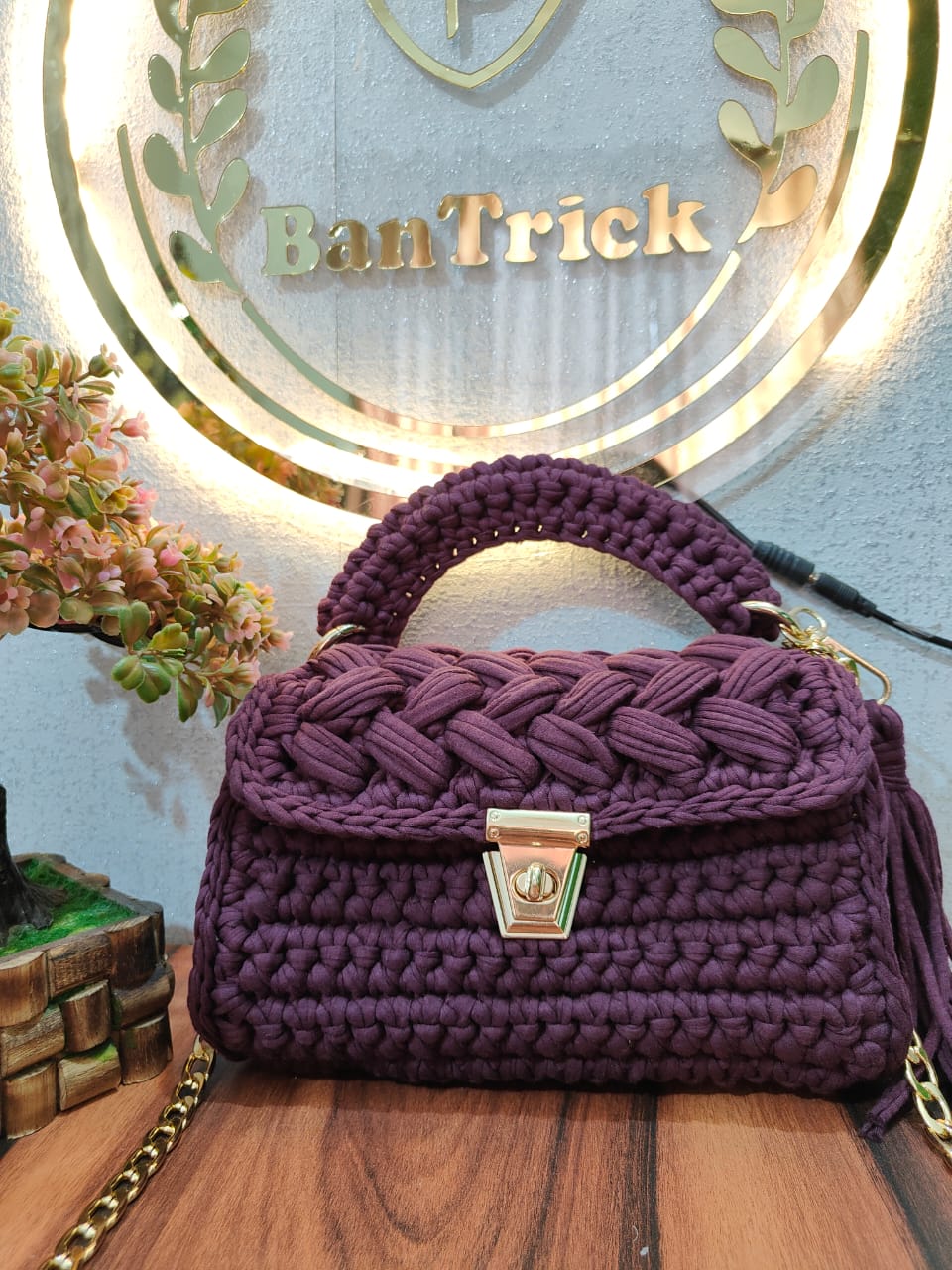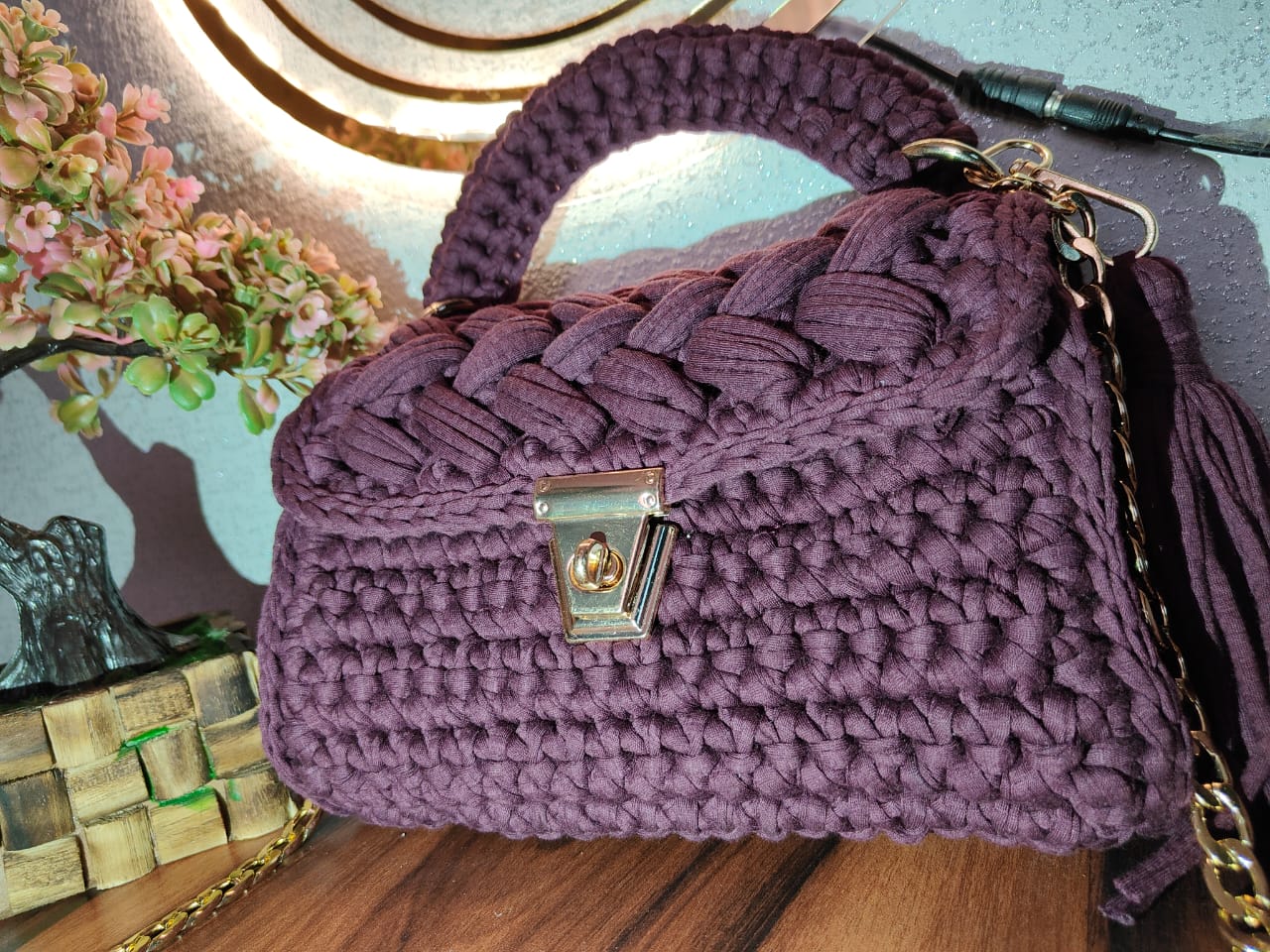 Hand Knitted Swivel Clasps Snap Hook Crochet Bag in purple Color